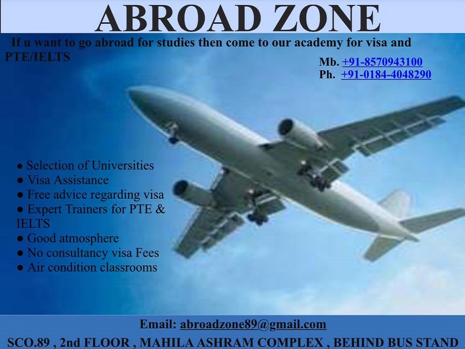 Established in the year 2016, Abroad Zone in Mahila Ashram Complex, Karnal is a top player in the category Tutorials For Pte in the Karnal. This well-known establishment acts as a one-stop destination servicing customers both local and from other parts of Karnal. Over the course of its journey, this business has established a firm foothold in it’s industry. The belief that customer satisfaction is as important as their products and services, have helped this establishment garner a vast base of customers, which continues to grow by the day. This business employs individuals that are dedicated towards their respective roles and put in a lot of effort to achieve the common vision and larger goals of the company. In the near future, this business aims to expand its line of products and services and cater to a larger client base. It is an effortless task in commuting to this establishment as there are various modes of transport readily available. It is at Mahila Ashram Complex, Behind Bus Stand, which makes it easy for first-time visitors in locating this establishment. It is known to provide top service in Visa Assistance, Language Classes For English, Immigration Consultants For Canada, Australia.